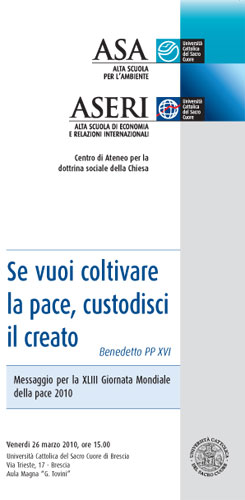 Alta Scuola per l’Ambiente (ASA), Centro di Ateneo per la dottrina sociale della Chiesa e Alta Scuola di Economia e Relazioni Internazionali (ASERI) promuovono una riflessione multidisciplinare sul senso religioso del Messaggio di S.S. Benedetto XVI per la XLIII Giornata mondiale della pace “Se vuoi coltivare la pace, custodisci il creato”. Venerdì 26 marzo 2010, alle ore 15, presso l’Aula Magna “G. Tovini” dell’Università Cattolica del Sacro Cuore di Brescia, mons. Mario Toso, Segretario del Pontificio Consiglio della Giustizia e della Pace, terrà una lectio sul tema. I lavori saranno introdotti da S.E. mons. Luciano Monari, Vescovo di Brescia, dal prof. Evandro Botto, Direttore del Centro di Ateneo per la dottrina sociale della Chiesa, e dal prof. Pierluigi Malavasi, Direttore dell’Alta Scuola per l’Ambiente. Le conclusioni saranno curate dalla prof. Simona Beretta, Direttore del Master in Cooperazione internazionale per lo sviluppo, ASERI. Per info: http://asa.unicatt.it/ |