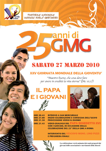La Diocesi di Forlì-Bertinoro invita tutti i giovani a festeggiare la XXV Giornata Mondiale della Gioventù sabato 27 marzo p.v. Appuntamento per tutti alle ore 20.45 presso la Chiesa di San Mercuriale dove inizierà la Via Crucis fino al Duomo. Al termine sarà trasmesso il video del dialogo tra i giovani e Papa Benedetto XVI, in occasione della celebrazione del 25° della Gmg a Roma. Interverrà il Vescovo Mons. Lino Pizzi per un momento di preghiera cui seguirà la benedizione finale.La celebrazione verrà animata dai canti proposti dai giovani delle associazioni e movimenti della Diocesi. Nella serata si raccoglieranno le offerte a favore della Terra Santa. Per info: http://www.pigifo.it/ |
