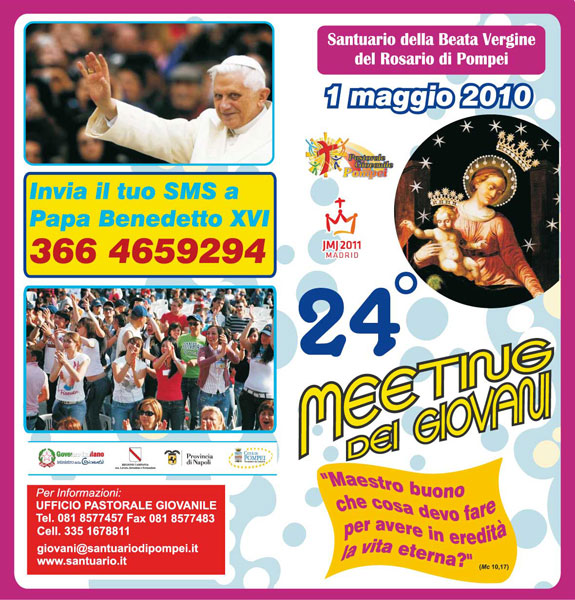 Mancano ormai pochi giorni alla 24ª edizione del Meeting dei giovani e Pompei si prepara ad accogliere i pensieri, le testimonianze e le preghiere delle migliaia di ragazzi che “inonderanno” l’Area Meeting dove, come ogni anno, si svolgerà la manifestazione. Il Meeting dei giovani è un’iniziativa del Pontificio Santuario della Beata Vergine del Santo Rosario di Pompei. Rappresentanti del mondo cattolico e delle istituzioni, di sportivi e di artisti offriranno spunti di riflessione al popolo del Meeting. Tra questi, il cantautore Angelo Branduardi, che concluderà l'appuntamento con un concerto dedicato a Papa Benedetto XVI, bersaglio di recenti attacchi mediatici. Attraverso le note del concerto di Branduardi e un momento di preghiera, il Meeting esprimerà tutta la sua solidarietà al Pontefice, al quale ognuno potrà manifestare il suo affetto inviando un sms al 3664659294. Tutti gli sms inviati saranno raccolti in un “diario” che sarà donato al Papa durante un’udienza speciale. Quest’anno il tema del Meeting è “Maestro buono, che cosa devo fare per avere in eredità la vita eterna?”, lo stesso del 25° anniversario di istituzione della Giornata mondiale della gioventù. Il tema farà da filo conduttore di un incontro-dibattito tra i giovani e alcuni ospiti d’eccezione dell’evento. Per info: http://www.pastoralegiovanilepompei.it/ |