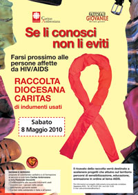 Sabato 08 maggio 2010 la Caritas Ambrosiana e la Pastorale Giovanile della Arcidiocesi di Milano organizzano una raccolta diocesana di indumenti usati. Titolo dell’iniziativa: “Se li conosci non li eviti - Farsi prossimo alle persone affette da HIV/AIDS”. Il ricavato della raccolta verrà destinato a sostenere progetti che attuino sul territorio percorsi di sensibilizzazione, educazione, animazione in ordine al tema dell'AIDS. La raccolta di indumenti usati è una delle proposte di volontariato caritativo e di formazione al servizio a cura di Caritas Ambrosiana e della Pastorale Giovanile. Per info: http://www.chiesadimilano.it/giovani |