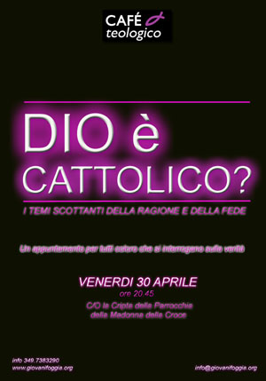 Venerdì 30 aprile 2010 presso la Cripta della Parrocchia Madonna della Croce a Foggia Ci siamo! Debutta il Cafè Teologico! Il Café è uno spazio accogliente, nel quale giovani e adulti possono entrare per riflettere sui temi scottanti della fede e dell’apologetica. Questo nuovo format, finalizzato a fornire a tutti degli strumenti concettuali per poter rendere ragione della loro fede, prevede degli incontri nei quali si propongono tematiche quali,il primo sarà: Dio è Cattolico? La serata inizia con un momento di accoglienza (con della musica lounge di sottofondo) alle 20.45, nel quale gli ospiti si siedono a dei tavolini e prendono caffè e tisane. Alle 21 il relatore presenta la tematica per circa 45 minuti. Segue un breve momento in cui chi lo desidera può scrivere una domanda su un foglietto prestampato. Per i successivi 30 minuti il relatore risponderà alle domande scritte. La serata si conclude con un ulteriore momento di sottofondo, in cui i partecipanti possono continuare a discutere nei tavolini. Gli incontri sono aperti ai giovani, ma anche ad adulti e persone che semplicemente s’interrogano sulla verità anche ai non credenti. La formula si è ritrovata vincente, soprattutto perché con le domande scritte nessuno può monopolizzare la discussione, che così rimane aperta. Ciò che rende la serata interessante è il clima disteso e rilassato creato dall’ambiente, dalla musica, dalle bevande, dalla sistemazione degli ospiti non su sedie disposte a conferenza, ma attorno a dei tavolini da bar. Gli argomenti sono "scottanti", ossia cercano di intercettare le critiche e le inesattezze che, di solito, emergono nelle conversazioni tra amici. Essi vengono affrontati sempre con un taglio sintetico e apologetico, in modo da fornire atteggiamenti e conoscenze che possano aiutare gli evangelizzatori a portare l’interlocutore verso la verità. Il Café Teologico presenta, ovviamente, la dottrina cattolica espressa nel Catechismo della Chiesa Cattolica, manifestando (anche nella difficile scelta dei relatori) assoluta fedeltà al Magistero e al Papa Per info: www.giovanifoggia.org |
