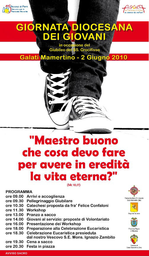 Si terrà il 2 giugno 2010 a Galati Mamertino, in occasione del Giubileo del SS. Crocifisso, la Giornata Diocesana dei Giovani organizzata dalla Pastorale Giovanile della Diocesi di Patti. Il titolo della GDG è “Maestro buono che cosa devo fare per avere in eredità la vita eterna?”. Appuntamento per tutti i giovani alle 9:30 per terminare la sera con la Festa in piazza. |