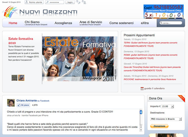 “E’ on line il nuovo sito di Nuovi Orizzonti www.nuoviorizzonti.org con tantissime novità, un articolo a settimana nella sezione News, i video continuamente aggiornati, lo shop on line con la possibilità di acquistare direttamente via internet libri, cd e tanto altro... Ma la novità più grande è che nella home page ogni giorno Chiara Amirante scrive un testo di aggiornamento o di breve meditazione sulla Parola del Giorno! Come sai in ogni comunità Nuovi Orizzonti la mattina meditiamo il Vangelo del Giorno e scegliamo una frase da vivere tutti insieme; questo esercizio ha cambiato la mia vita e lo facevo quand'ero a Padova col grandissimo desiderio di lasciare tutto per Gesù e sentivo la distanza dalla comunità. Ora le distanze si annullano non solo "spiritualmente" ma anche grazie ad internet!!! Oggi abbiamo la possibilità di avere tutti una frase comune condivisa direttamente dalla nostra Fondatrice!!!” |
