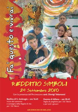 La celebrazione della Redditio Symboli e la consegna della Regola di vita nelle mani dell'Arcivescovo costituiscono la mèta del cammino spirituale dei 18/19enni, solitamente strutturato in due anni. La Regola di vita rappresenta un vero abbandono della libertà del 18/19enne a Dio: essa è uno strumento prezioso che lo guida nei gesti, nei ritmi e che lo aiuta a sostenere quotidianamente il suo rapporto con il Signore ed a compiere scelte precise e praticabili di formazione personale, di servizio nella comunità cristiana e di testimonianza nei diversi ambiti di vita. Il tema della veglia, in sintonia con il Percorso pastorale diocesano di quest'anno, si ispira al brano del Vangelo di Luca: Ed ecco, un dottore della Legge si alzò per metterlo alla prova e chiese: «Maestro, che cosa devo fare per ereditare la vita eterna?». Gesù gli disse: «Che cosa sta scritto nella Legge? Come leggi?». Costui rispose: «Amerai il Signore tuo Dio con tutto il tuo cuore, con tutta la tua anima, con tutta la tua forza e con tutta la tua mente, e il tuo prossimo come te stesso». Gli disse: «Hai risposto bene; fa' questo e vivrai». Per info: http://www.chiesadimilano.it/giovani/Servizio_Giovani/menu3sx/Redditio/158712.html |