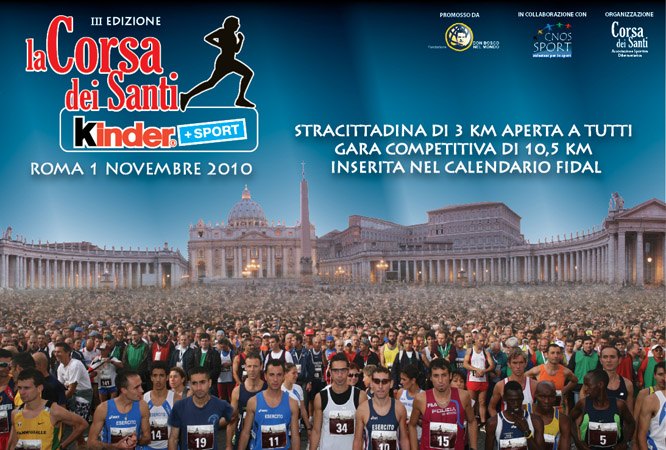Giunta alla sua terza edizione, la Corsa dei Santi è cresciuta progressivamente mantenendo fede ai suoi molteplici scopi istituzionali che sono quelli di: - dare visibilità di festa popolare alla celebrazione di Ognissanti dalla quale prende il nome - portare in primo piano un’emergenza umanitaria che chiede la nostra solidarietà - promuovere i valori dello sport secondo la tradizione educativa salesiana Il percorso che si snoda all’interno del centro storico di Roma, tra piazze, chiese, palazzi gentilizi e vestigia antiche, ne fa una delle corse più belle del mondo. La presenza di atleti in gara insieme a intere famiglie in festa ne fanno un’occasione per animare di gioia e colori il giorno dedicato alla schiera invisibile di coloro che, nella chiesa, hanno raggiunto l’importante traguardo della santità. La Fondazione Don Bosco nel Mondo si appresta ad avviare i preparativi della terza edizione della “Corsa dei Santi” sempre inprogramma a Roma per il primo novembre 2010. La Corsa supporta in ogni sua edizione una finalità benefica. Nella prima edizione, tramite i proventi del numero unico di SMS Solidale pubblicizzato nel corso della trasmissione televisiva sono stati raccolti fondi per le Opere Mamma Margherita di Lubumbashi - Congo. Nella seconda edizione la raccolta fondi sosterrà il progetto missionario in favore dei RAGAZZI ex-SOLDATO dello Sri Lanka. La finalità benefica di questa terza edizione della corsa è quella di perfezionare la seconda fase di un programma di soccorso alle vittime delle inondazioni in Pakistan. Dopo una prima fase mirata a provvedere alle immediate necessità della sopravvivenza attraverso la consegna di un "kit" alimentare (farina e olio per il pane locale, il chapati, lenticchie, zucchero, tè e medicine), si tratta ora di riportare le famiglie alle case e alle attività che hanno dovuto abbandonare. Arrivo e partenza da Piazza San Pietro. Per info: http://www.corsadeisanti.it/ |