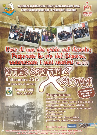 “Domenica 5 Dicembre, dalle ore 10,00 a Condrò (ME) , si svolgerà il Ritiro Diocesano dei Giovani, occasione per iniziare insieme l'Avvento sollecitati ed educati dalla Parola di Dio. Si tratta del primo appuntamento del cammino di quest'anno che culminerà con la partecipazione alla GMG di Madrid. Facendo riferimento alla brano evangelico della II Domenica di Avvento, Mons. Pietro Aliquò, per tanti anni direttore dell'Ufficio Catechistico Diocesano, aiuterà i giovani a riflettere attraverso un forte momento di catechesi. Ci sarà il tempo per meditare (anche davanti all'Eucaristia) e di accostarsi al Sacramento della Riconciliazione. Nel pomeriggio, dopo le riflessioni in gruppo, concluderemo con la Celebrazione Eucaristica presieduta dall'Arcivescovo Mons. Calogero La Piana.” |