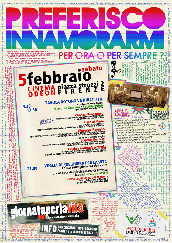 In occasione della XXXIII «Giornata per la VITA», il Centro Diocesano di Pastorale Familiare di Firenze organizza un'incontro per i ragazzi delle scuole superiori nella mattinata di sabato 5 febbraio 2011 e una Veglia diocesana di Preghiera, presieduta dall'arcivescovo Mons. Giuseppe Betori, la sera dello stesso giorno. |