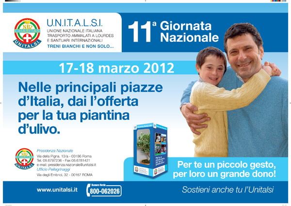 Sabato 17 e Domenica 18 marzo 2012, l’Unitalsi celebra l’11ma edizione della sua Giornata Nazionale, proponendo - in oltre 3000 piazze italiane – una “piantina d’ulivo”, simbolo di pace e fratellanza. Il ricavato delle offerte sarà utilizzato dall’Unitalsi per sostenere i numerosi progetti di carità in cui l’associazione è impegnata quotidianamente sull’intero territorio nazionale, al servizio delle fasce più disagiate della popolazione, grazie al costante e generoso impegno dei propri volontari.