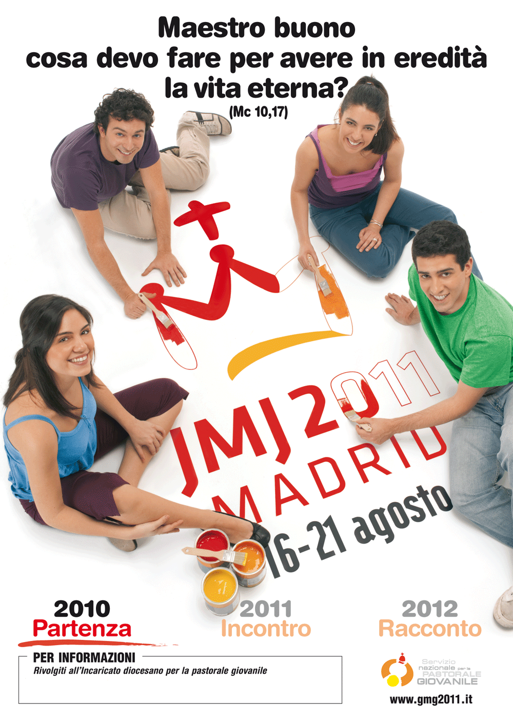 nei giorni 15 e 16 marzo arriverà in tutte le parrocchie, in allegato al quotidiano AVVENIRE, un manifesto di invito alla Giornata Mondiale della Gioventù di Madrid.Vi preghiamo di appenderlo e di compilarlo nello spazio “per informazioni”. Il manifesto giungerà in duplice copia: vi chiediamo di evitare ogni spreco e utilizzare gli eventuali manifesti avanzati portandoli nelle università, nelle scuole medie superiori, nelle palestre e in altri luoghi frequentati da giovani. Il Signore vi benedica per la vostra collaborazione. |